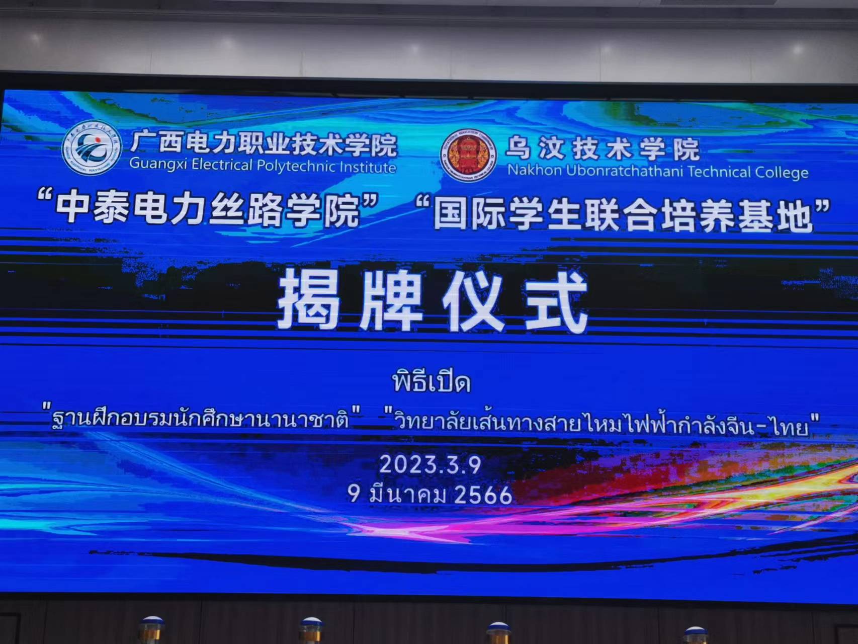 广西电力职业技术学院与乌汶技术学院“中泰电力丝路学院”的“国际学生联合培养基地”揭牌仪式于2023年3月10日在中国广西电力职业技术学院举行。